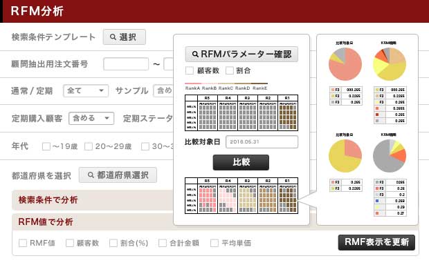 顧客の購買行動を「最終購買日(Recency)」「購買頻度(Frequency)」「累計購買金額(Monetary)」の3つの指標から分類し、顧客の選別と格付けを行うことが可能になります。