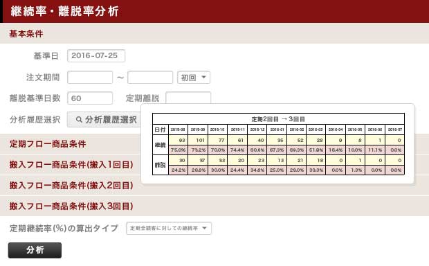 購入のフローをチャート式に表示することで、継続率・離脱率を可視化します。フローチャートにすることで購入の全体の流れが把握できるため、CRMプロセスの生産性が高まります。