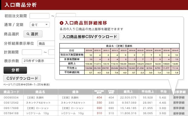 初回に購入された商品ごとにその後の顧客売上や、LTV、購入継続回数などを把握することができます。 例えば、初回媒体(広告)などでどの商品を訴求すると売上最大化を実現できるのかを把握することができます。